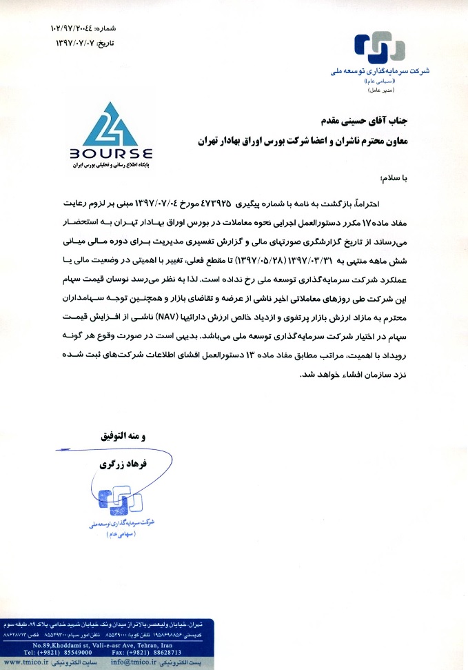 به گزارش کدال نگر بورس ٢۴، شرکت سرمایه گذاری توسعه ملی اعلام داشت به نظر می رسد نوسان قیمت سهام این شرکت طی روزهای معاملاتی اخیر ناشی از عرضه و تقاضای بازار و همچنین توجه سهامداران محترم به مازاد ارزش پرتفوی و ازدیاد خالص ارزش دارائیها(NAV)ناشی از افزایش قیمت سهام در اختیار شرکت سرمایه گذاری توسعه ملی می باشد.