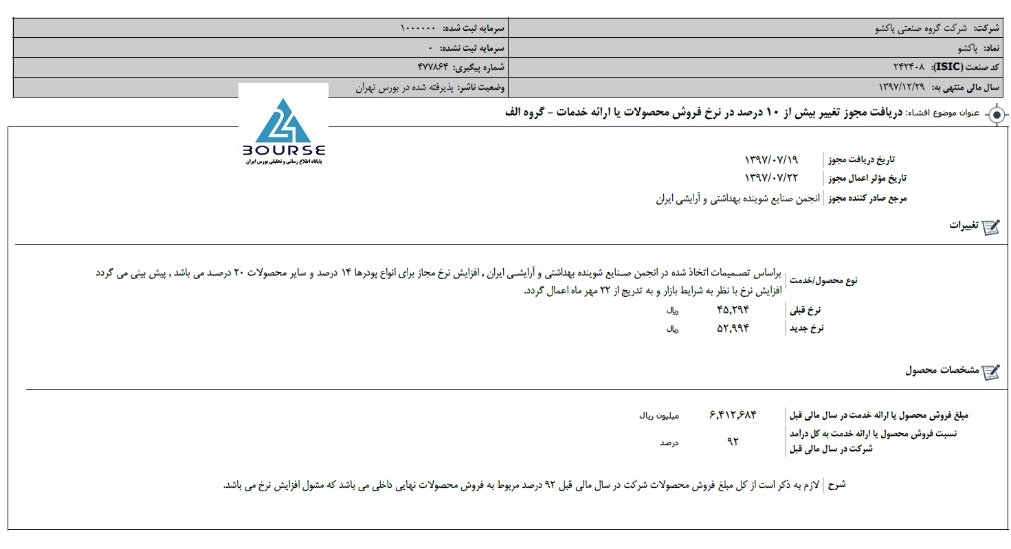 به گزارش کدال نگر بورس ٢۴، شرکت گروه صنعتی پاکشو اعلام داشت بر اساس تصمیمات اتخاذ شده در انجمن صنایع شوینده بهداشتی و آرایشی ایران افزایش نرخ مجاز برای انواع پودرها ١۴ درصد و سایر محصولات ٢٠ درصد می باشد. پیش بینی می گردد این افزایش نرخ به تدریج از ٢٢ مهر ماه اعمال گردد.