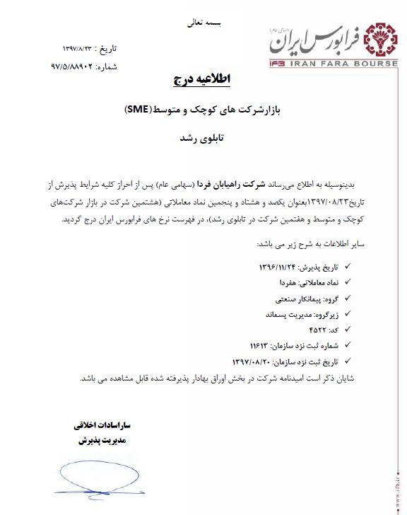 به گزارش بورس٢۴، شرکت راهیابان فردا در بازار شرکت های کوچک و متوسط درج نماد شد. گفتنی است،این شرکت در گروه پیمانکار صنعتی و با نماد همفردا در زیر گروه مدیریت پسماند قرار دارد.