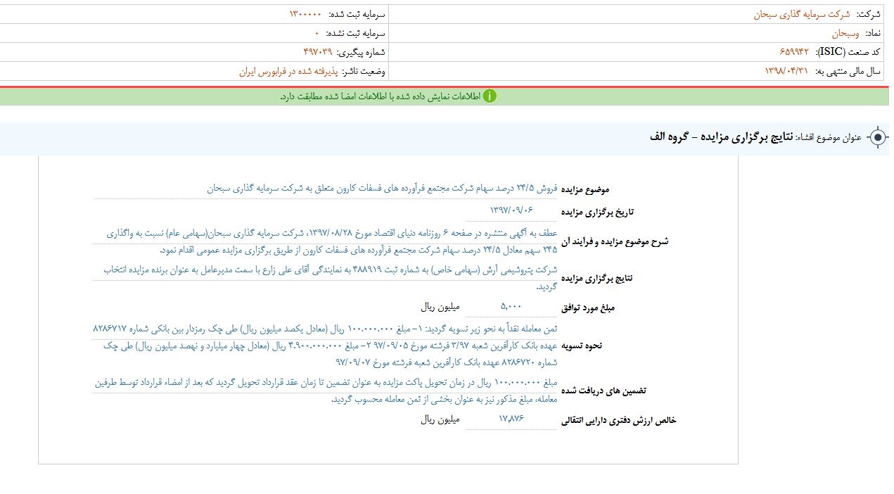 به گزارش کدال نگر بورس٢۴، سرمایه گذاری سبحان خبر از واگذاری سهام خود در فسفات کارون را داده است