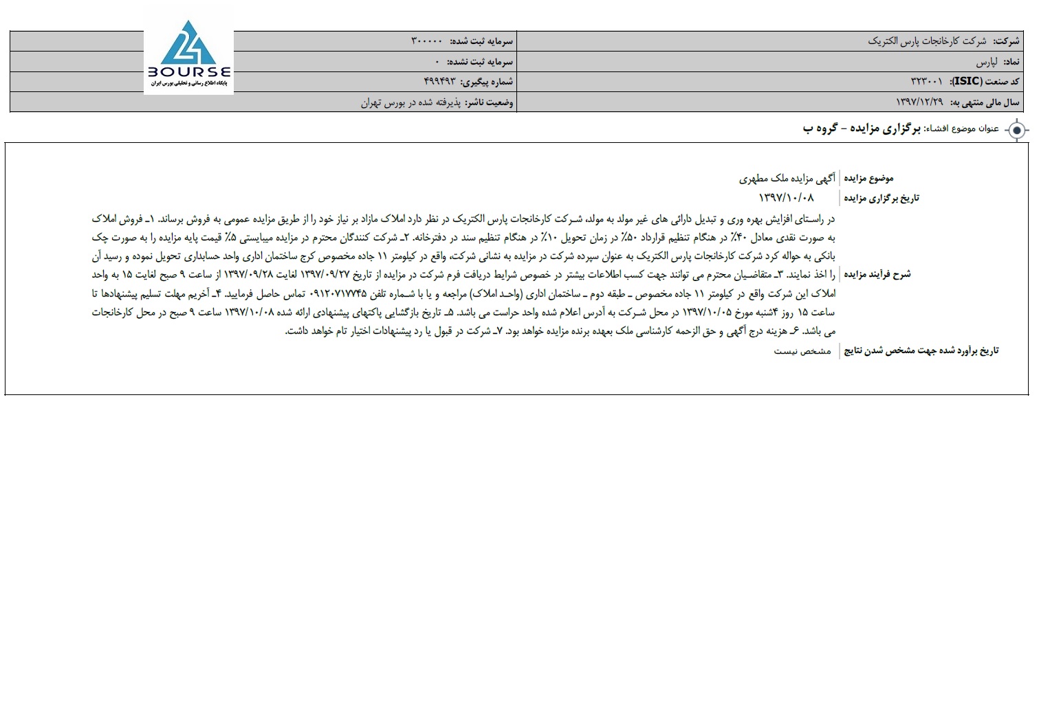 به گزارش کدال نگر بورس ٢۴، شرکت کارخانجات پارس الکتریک اعلام داشت در راستای افزایش بهره وری و تبدیل دارائی های غیر مولد به مولد، شرکت کارخانجات پارس الکتریک در نظر دارد املاک مازاد بر نیاز خود را از طریق مزایده عمومی به فروش برساند. ١ـ فروش املاک به صورت نقدی معادل ۴٠% در هنگام تنظیم قرارداد ۵٠% در زمان تحویل ١٠% در هنگام تنظیم سند در دفترخانه. ٢ـ شرکت کنندگان محترم در مزایده میبایستی ۵% قیمت پایه مزایده را به صورت چک بانکی به حواله کرد شرکت کارخانجات پارس الکتریک به عنوان سپرده شرکت در مزایده به نشانی شرکت، واقع در کیلومتر ١١ جاده مخصوص کرج ساختمان اداری واحد حسابداری تحویل نموده و رسید آن را اخذ نمایند. ٣ـ متقاضیان محترم می توانند جهت کسب اطلاعات بیشتر در خصوص شرایط دریافت فرم شرکت در مزایده از تاریخ ١٣٩٧/٠٩/٢٧ لغایت ١٣٩٧/٠٩/٢٨ از ساعت ٩ صبح لغایت ١۵ به واحد املاک این شرکت واقع در کیلومتر ١١ جاده مخصوص ـ طبقه دوم ـ ساختمان اداری (واحد املاک) مراجعه و یا با شماره تلفن ٠٩١٢٠٧١٧٧۴۵ تماس حاصل فرمایید. ۴ـ آخریم مهلت تسلیم پیشنهادها تا ساعت ١۵ روز ۴شنبه مورخ ١٣٩٧/١٠/٠۵ در محل شرکت به آدرس اعلام شده واحد حراست می باشد. ۵ـ تاریخ بازگشایی پاکتهای پیشنهادی ارائه شده ١٣٩٧/١٠/٠٨ ساعت ٩ صبح در محل کارخانجات می باشد. ۶ـ هزینه درج آگهی و حق الزحمه کارشناسی ملک بعهده برنده مزایده خواهد بود. ٧ـ شرکت در قبول یا رد پیشنهادات اختیار تام خواهد داشت.