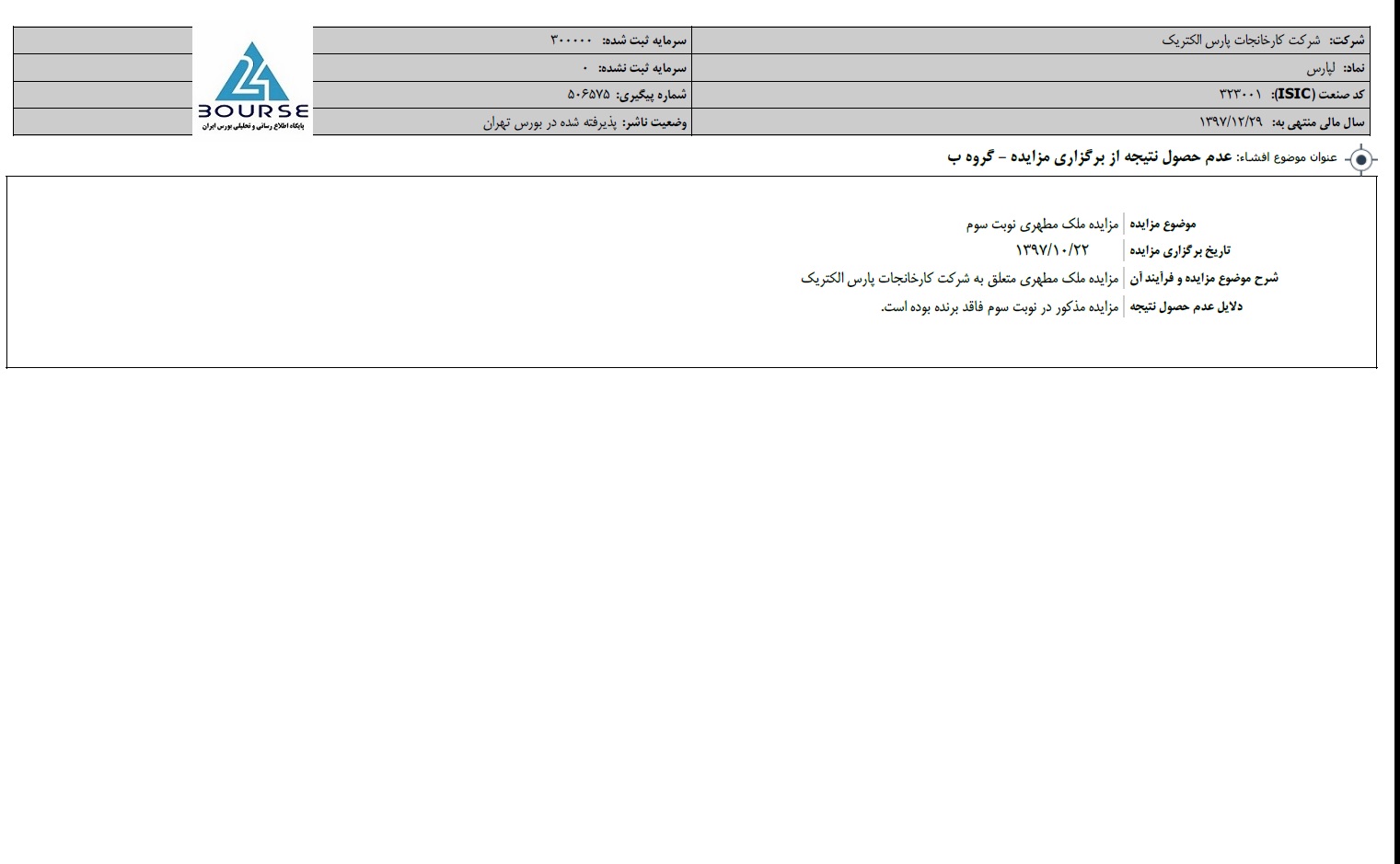 به گزارش کدال نگر بورس ٢۴، شرکت کارخانجات پارس الکتریک اعلام داشت مزایده ملک مطهری در نوبت سوم فاقد برنده بوده است.