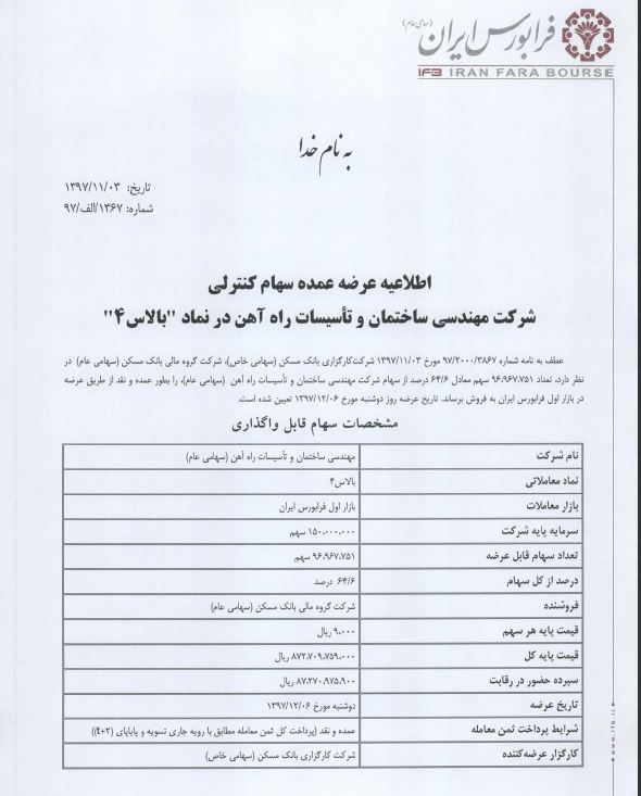 به گزارش بورس٢۴، گروه مالی مسکن به عنوان سهامدار عمده و مالک مهندسی ساختمان و تاسیسات راه آهن بالاس بلوک مدیریتی ۶۴.۶ درصدی این شرکت را برای فروش آگهی کرده است. گفتنی است، این سهم با قیمت پایه هر سهم ٩٠٠ تومان عرضه خواهد شد
