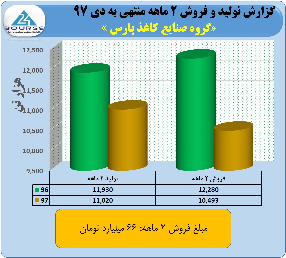 به گزارش کدال نگر بورس ٢۴ شرکت گروه صنایع کاغذ پارس در ٢ ماهه منتهی به دی ١٣٩٧ از فروش محصولات خود ۶۶ میلیارد تومان درآمد کسب نمود. هم چنین در دی ماه مبلغ فروش به ٣٢ میلیارد تومان رسید. گفتنی است مبلغ فروش این شرکت در مدت ٢ ماهه سال ٩٧ در مقایسه با مدت مشابه سال قبل ١٠۴ درصد رشد داشته است.