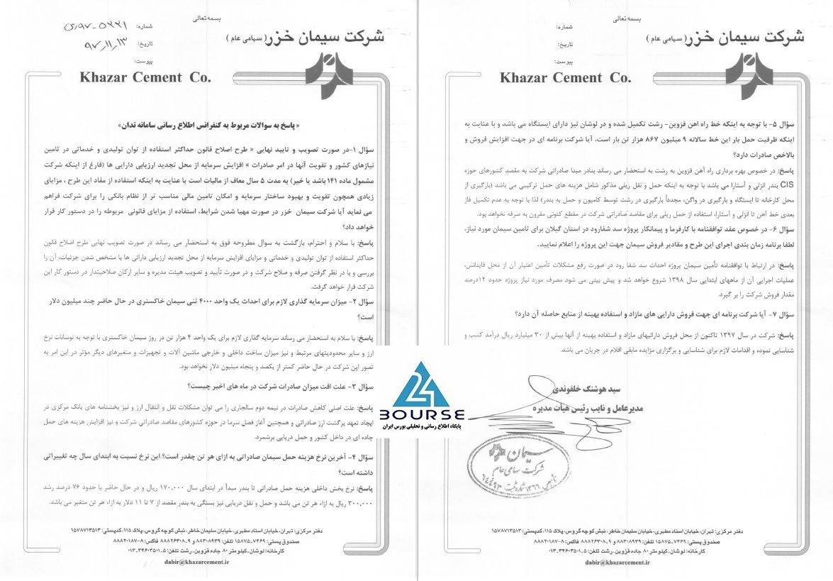 به گزارش کدال نگر بورس ٢۴، شرکت سیمان خزر اهم مطالب مطرح شده در کنفرانس اطلاع رسانی را پاسخ داد.
