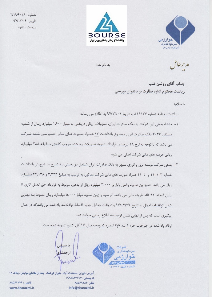 به گزارش کدال نگر بورس ٢۴، شرکت سرمایه گذاری خوارزمی در خصوص منشا بدهی شرکت سرمایه گذاری خوارزمی و شرکت فرعی توسعه برق و انرژی سپهر به بانک صادرات ایران و اثرات سود و زیانی بر شرکت و شرکت فرعی شفاف سازی نمود.