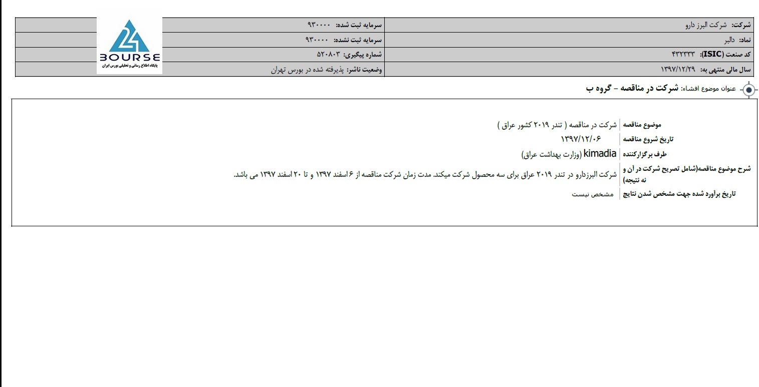 به گزارش کدال نگر بورس ٢۴، شرکت البرز دارو اعلام داشت در تندر ٢٠١٩ عراق برای سه محصول شرکت میکند. مدت زمان شرکت مناقصه از ۶ اسفند ١٣٩٧ و تا ٢٠ اسفند ١٣٩٧ می باشد.