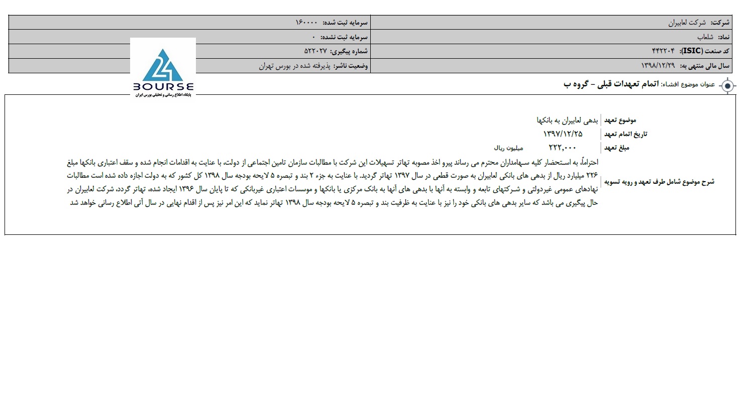 به گزارش کدال نگر بورس ٢۴، شرکت لعابیران اعلام داشت پیرو اخذ مصوبه تهاتر تسهیلات این شرکت با مطالبات سازمان تامین اجتماعی از دولت، با عنایت به اقدامات انجام شده و سقف اعتباری بانکها مبلغ ٢٢۶ میلیارد ریال از بدهی های بانکی لعابیران به صورت قطعی در سال ١٣٩٧ تهاتر گردید. با عنایت به جزء ٢ بند و تبصره ۵ لایحه بودجه سال ١٣٩٨ کل کشور که به دولت اجازه داده شده است مطالبات نهادهای عمومی غیردولتی و شرکتهای تابعه و وابسته به آنها با بدهی های آنها به بانک مرکزی یا بانکها و موسسات اعتباری غیربانکی که تا پایان سال ١٣٩۶ ایجاد شده، تهاتر گردد، شرکت لعابیران در حال پیگیری می باشد که سایر بدهی های بانکی خود را نیز با عنایت به ظرفیت بند و تبصره ۵ لایحه بودجه سال ١٣٩٨ تهاتر نماید که این امر نیز پس از اقدام نهایی در سال آتی اطلاع رسانی خواهد شد