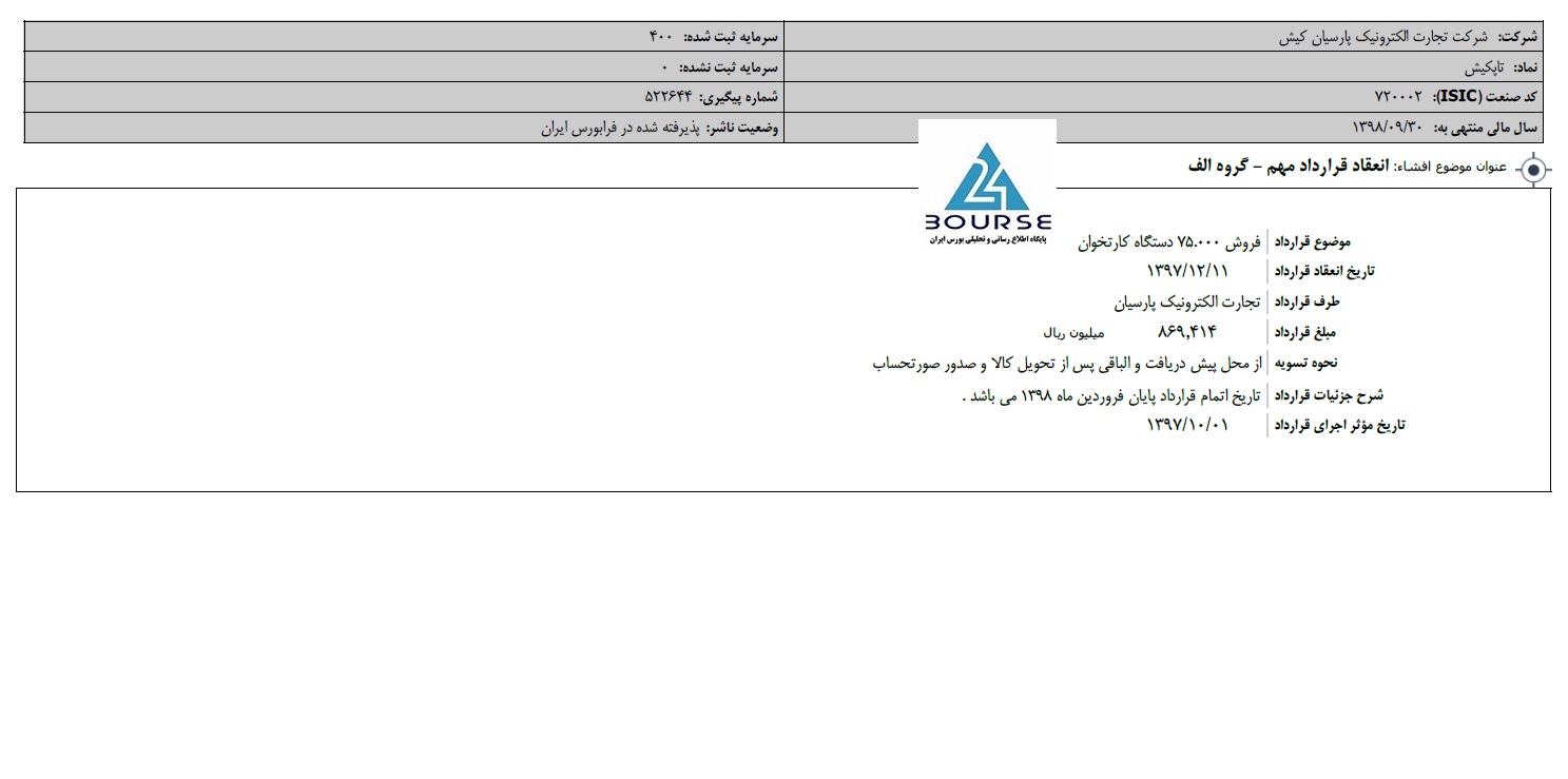 به گزارش کدال نگر بورس ٢۴، شرکت تجارت الکترونیک پارسیان کیش از انعقاد قرارداد فروش ٧۵.٠٠٠ دستگاه کارتخوان خبر داد.