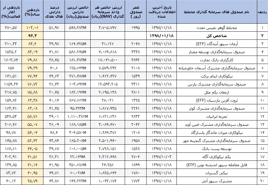 در میان 20 صندوق مختلط نیز گوهر نفیس تمدن توانست بالاتر از شاخص کل به سرمایه گذاران خود بازدهی بدهد.