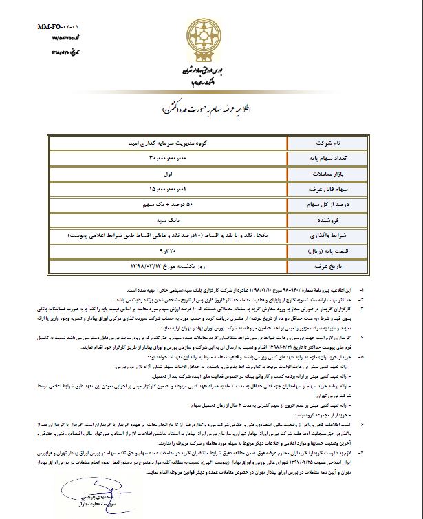 بانک سپه سهام مدیریتی سرمایه گذاری امید را با قیمت پایه هر سهم ٩٣٢ تومان آگهی کرد