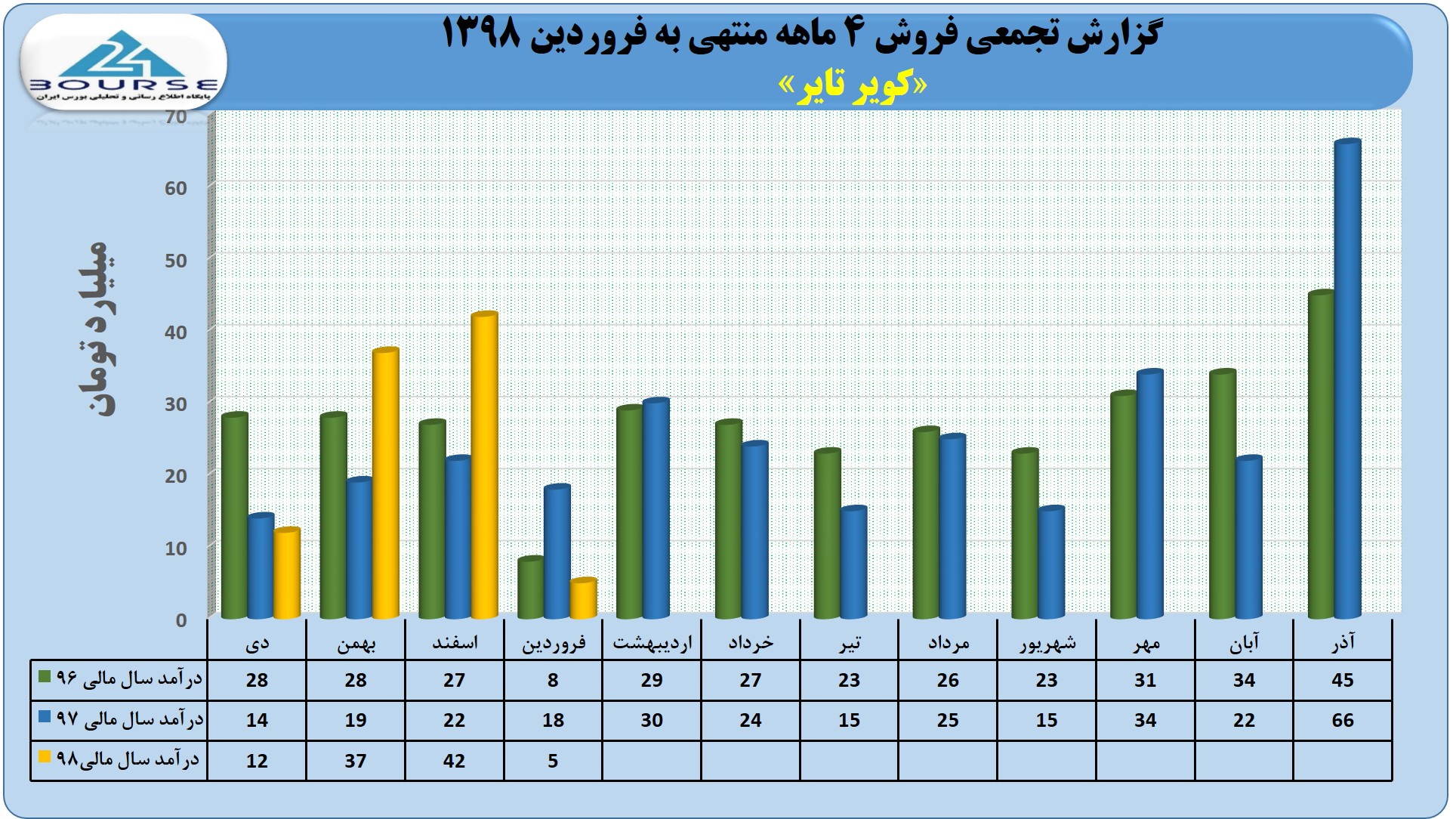 به گزارش کدال نگر بورس ٢۴، شرکت کویر تایر در ۴ ماهه نخست سال مالی منتهی به آذر ١٣٩٨ از فروش محصولات خود ٩۶ میلیارد تومان درآمد کسب نمود.