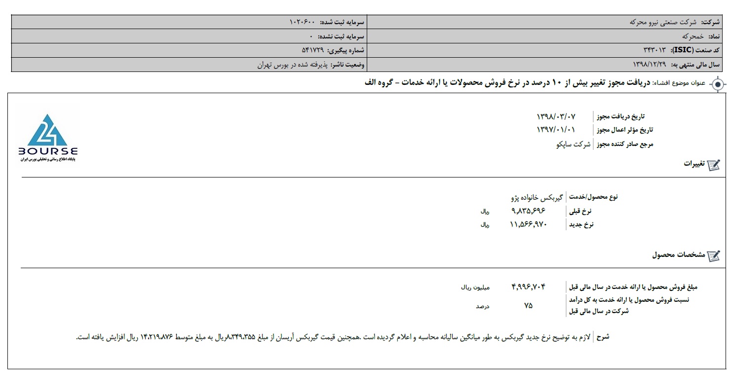 به گزارش کدال نگر بورس ٢۴، شرکت نیرو محرکه اعلام داشت نرخ جدید گیربکس به طور میانگین سالیانه محاسبه و اعلام گردیده است .همچنین قیمت گیربکس آریسان از مبلغ ٨،٣۴٩،٣۵۵ریال به مبلغ متوسط ١۴،٢١٩،٨٧۶ ریال افزایش یافته است.