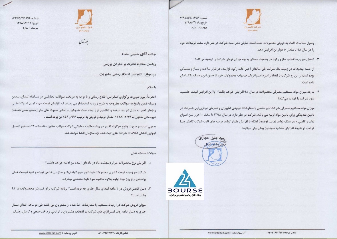 به گزارش کدال نگر بورس ٢۴، شرکت لعابیران اهم مطالب مطرح شده در کنفرانس اطلاع رسانی را منتشر نمود.
