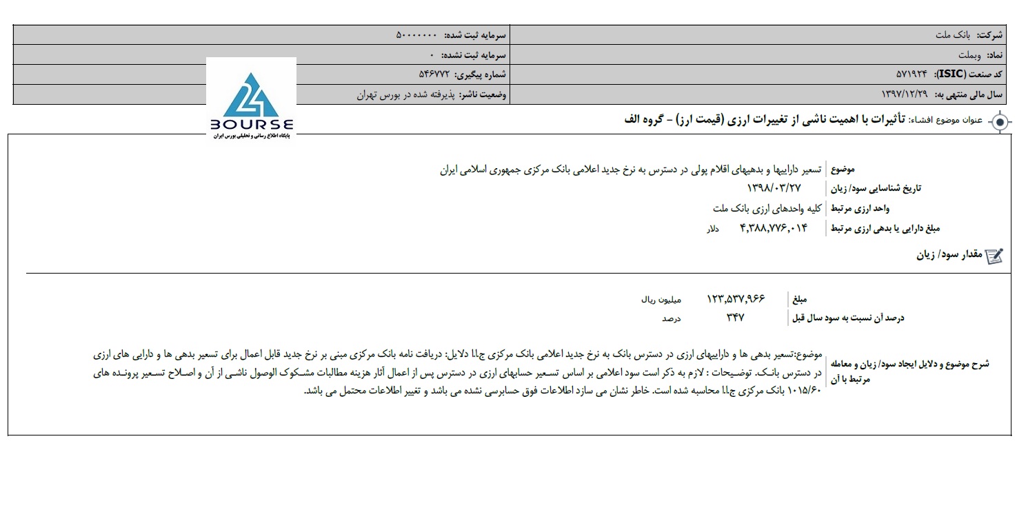 توضیحات بانک ملت در خصوص تاثیرات ناشی از تسعیر ارز