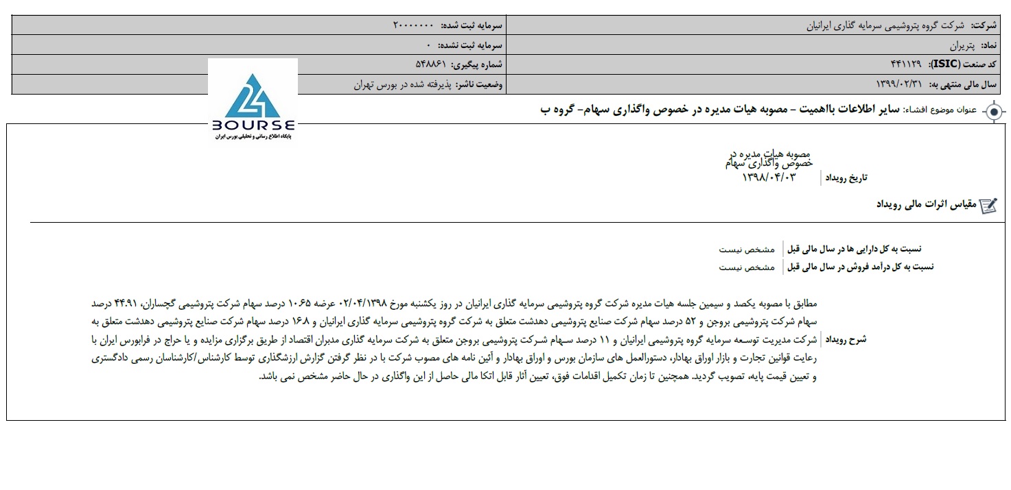 به گزارش کدال نگر بورس ٢۴، شرکت گروه پتروشیمی سرمایه گذاری ایرانیان اعلام داشت مطابق با مصوبه یکصد و سیمین جلسه هیات مدیره شرکت گروه پتروشیمی سرمایه گذاری ایرانیان در روز یکشنبه مورخ ١٣٩٨.٠۴.٠٢ عرضه ١٠.۶۵ درصد سهام شرکت پتروشیمی گچساران، ۴۴.٩١ درصد سهام شرکت پتروشیمی بروجن و ۵٢ درصد سهام شرکت صنایع پتروشیمی دهدشت متعلق به شرکت گروه پتروشیمی سرمایه گذاری ایرانیان و ١۶.٨ درصد سهام شرکت صنایع پتروشیمی دهدشت متعلق به شرکت مدیریت توسعه سرمایه گروه پتروشیمی ایرانیان و ١١ درصد سهام شرکت پتروشیمی بروجن متعلق به شرکت سرمایه گذاری مدبران اقتصاد از طریق برگزاری مزایده و یا حراج در فرابورس ایران با رعایت قوانین تجارت و بازار اوراق بهادار، دستورالعمل های سازمان بورس و اوراق بهادار و آئین نامه های مصوب شرکت با در نظر گرفتن گزارش ارزشگذاری توسط کارشناس/کارشناسان رسمی دادگستری و تعیین قیمت پایه، تصویب گردید. همچنین تا زمان تکمیل اقدامات فوق، تعیین آثار قابل اتکا مالی حاصل از این واگذاری در حال حاضر مشخص نمی باشد.