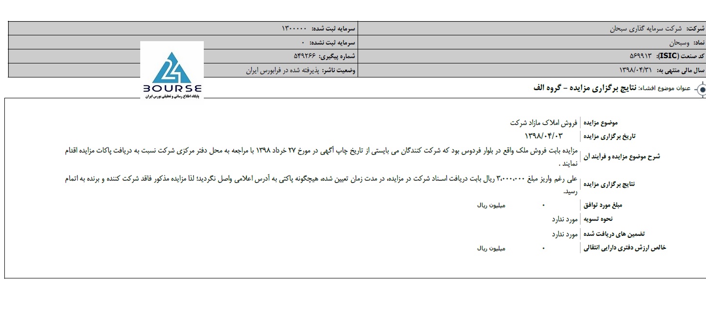 به گزارش کدال نگر بورس ٢۴، شرکت سرمایه گذاری سبحان اعلام داشت علی رغم واریز مبلغ ٣،٠٠٠،٠٠٠ ریال بابت دریافت اسناد شرکت در مزایده، در مدت زمان تعیین شده، هیچگونه پاکتی به آدرس اعلامی واصل نگردید؛ لذا مزایده فروش املاک مازاد شرکت فاقد شرکت کننده و برنده به اتمام رسید.
