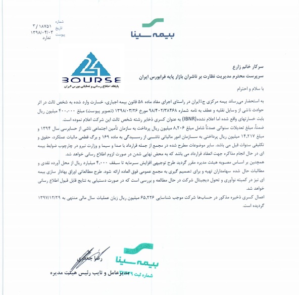 به گزارش کدال نگر بورس٢۴،بیمه سینا اعلام کرد در خصوص خسارت وارد شده به شخص ثالث در اثر حوادث ناشی از وسایل نقلیه مبلغ ۴٠میلیارد تومان واقع شده اما اعلام نشده به عنوان کسری ذخایر رشته شخص ثالث این شرکت اعلام نموده است.