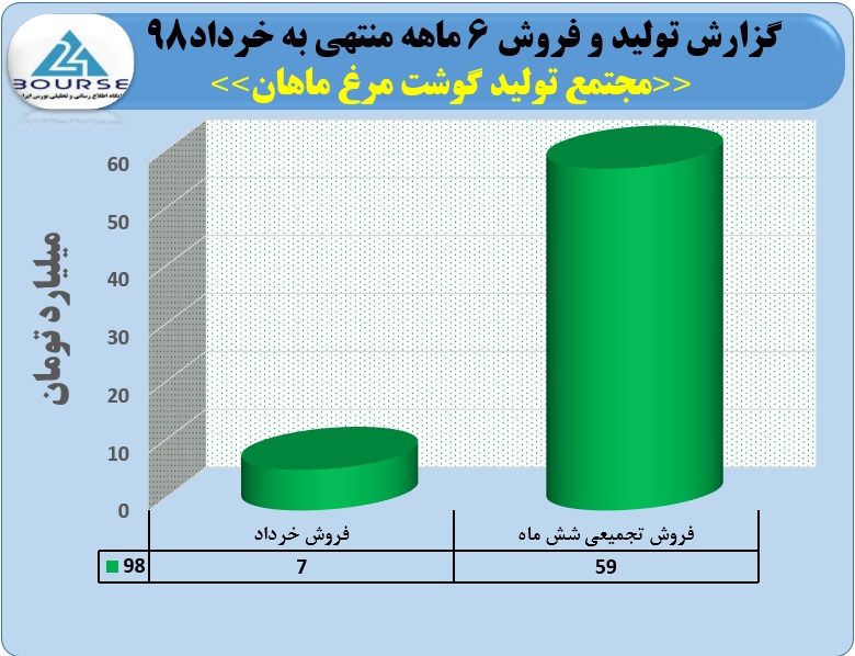 به گزارش کدال نگر بورس ٢۴، شرکت مجتمع تولید گوشت مرغ ماهان در شش ماهه منتهی به خرداد ١٣٩٨ از فروش محصولات خود۵٩ میلیارد تومان درآمد کسب نمود که مبلغ ٧ میلیارد تومان آن مربوط به فروش خرداد ماه می باشد. گفتنی است مبلغ فروش این شرکت در اردیبهشت ماه نیز ٧میلیارد تومان بود.