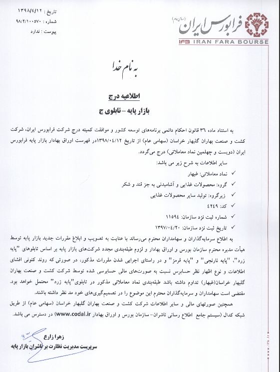 به گزارش بورس٢۴، شرکت گلبهار خراسان با نماد غبهار در گروه محصولات غذایی و آشامیدنی بازار پایه تابلوی ج فرابورس درج نماد شد