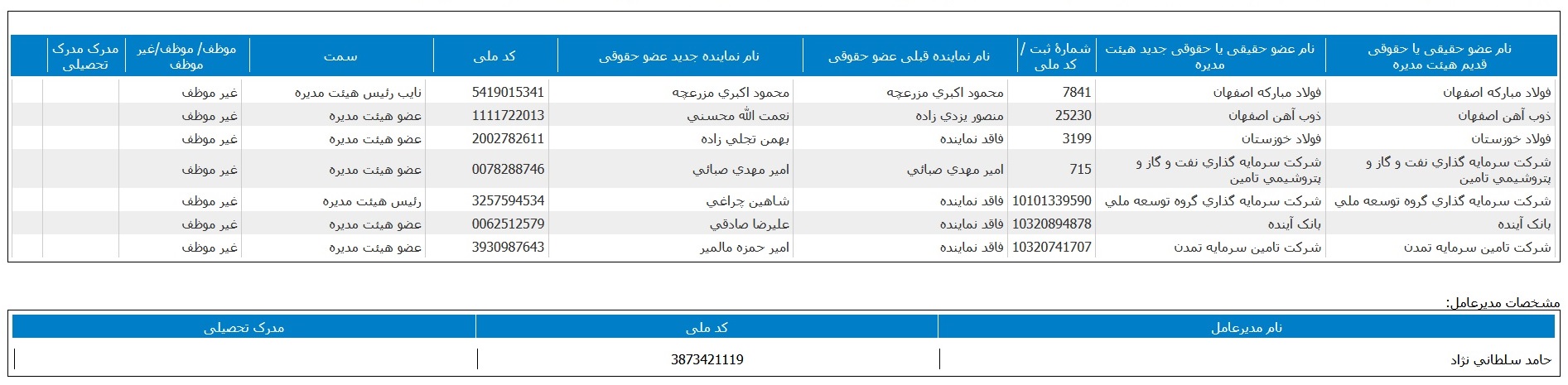 محمود اکبری ، نعمت الله محسنی و بهمن تجلی زاده نیز به ترتیب نمایندگان فولاد مبارکه ، ذوب آهن و فولاد خوزستان در هیات مدیره جدید بورس کالای ایران هستند.دیگر رخداد مهم امروز ابقای حامد سلطانی نژاد به عنوان مدیرعامل بود.