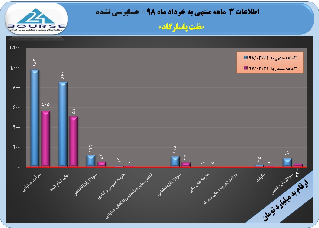 به گزارش کدال نگر بورس٢۴،نفت پاسارگاد در سه ماهه منتهی به خرداد ٩٨ مبلغ٣٧۴ریال سود برای هرسهم محقق کرده است که به نسبت دوره مشابه سال قبل ١۶٩درصد رشد کرده است سود دوره مشابه قبل ١٣٩ریال بود،گفتنی است درآمد های عملیاتی ٧۴درصد رشد کرده و هزینه های فروش نیز ۴٠درصد افزایش یافته است حال انکه سود عملیاتی ١۴٣درصد رشد و سایر درامد های عملیاتی نیز ۶٢٠درصد افزایش یافته است.