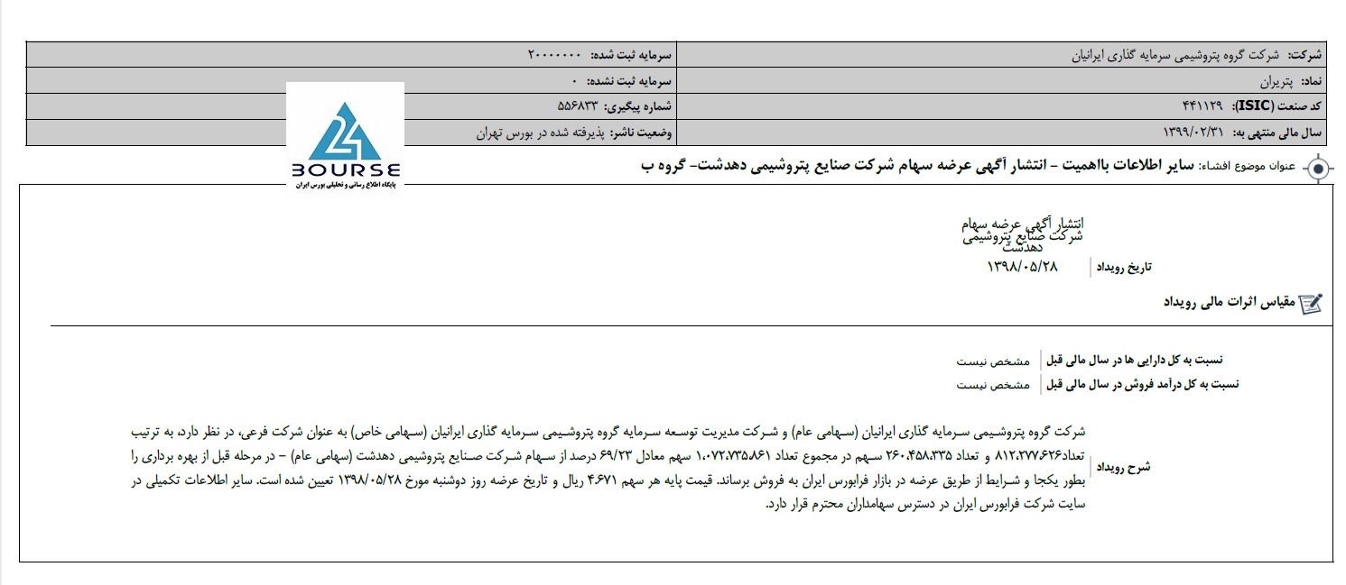 به گزارش کدال نگر بورس ٢۴، شرکت گروه پتروشیمی سرمایه گذاری ایرانیان اعلام داشت این شرکت و شرکت مدیریت توسعه سرمایه گروه پتروشیمی سرمایه گذاری ایرانیان (سهامی خاص) به عنوان شرکت فرعی، در نظر دارد، به ترتیب تعداد٨١٢،٢٧٧،۶٢۶ و تعداد ٢۶٠،۴۵٨،٣٣۵ سهم در مجموع تعداد ١،٠٧٢،٧٣۵،٨۶١ سهم معادل ۶٩/٢٣ درصد از سهام شرکت صنایع پتروشیمی دهدشت (سهامی عام) - در مرحله قبل از بهره برداری را بطور یکجا و شرایط از طریق عرضه در بازار فرابورس ایران به فروش برساند. قیمت پایه هر سهم ۴.۶٧١ ریال و تاریخ عرضه روز دوشنبه مورخ ١٣٩٨.٠۵.٢٨ تعیین شده است. سایر اطلاعات تکمیلی در سایت شرکت فرابورس ایران در دسترس سهامداران محترم قرار دارد.