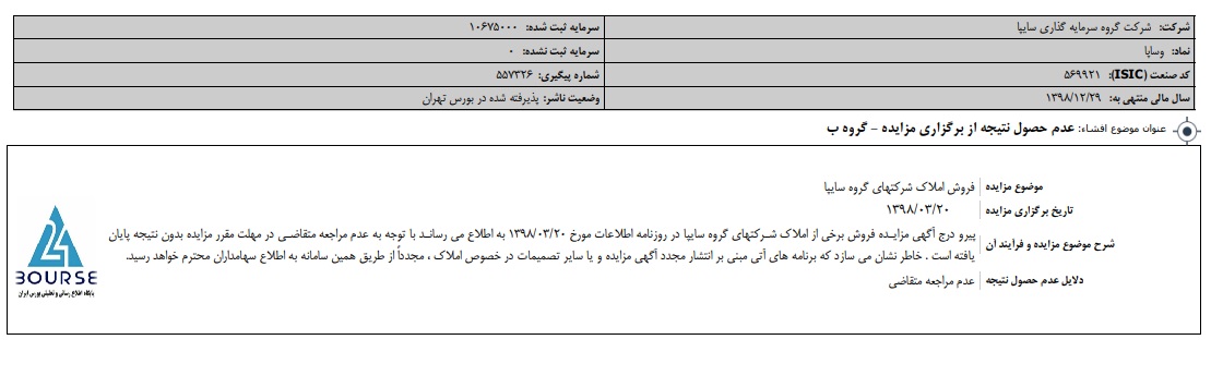 مزایده گروه سرمایه گذاری سایپا نتیجه ای نداشت