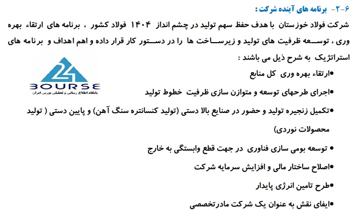 به گزارش کدال نگر بورس٢۴،فولاد خوزستان از برنامه ها و چشم انداز شرکت در قالب گزارش تفسیری اقدام به بیان نکات مهمی نمود.
