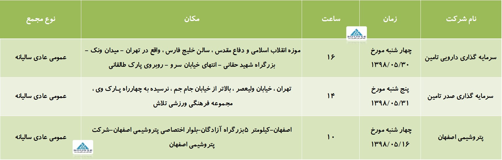 به گزارش کدال نگر بورس ٢۴، ٣ شرکت سهامداران خود را به حضور در مجمع فراخواندند.