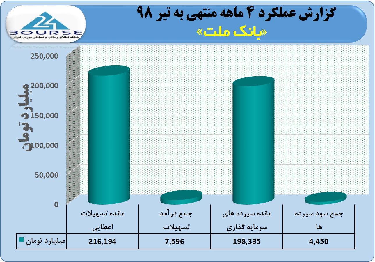 به گزارش کدال نگر بورس ٢۴، بانک ملت در عملکرد ۴ ماهه منتهی به تیر ١٣٩٨، حدود ٧۵٩۶ میلیارد تومان درآمد از تسهیلات اعطایی خود کسب نمود. هم چنین جمع سود اعطا شده به سپرده های سرمایه گذاری شده در این بانک به ۴۴۵٠ میلیارد تومان رسید.
