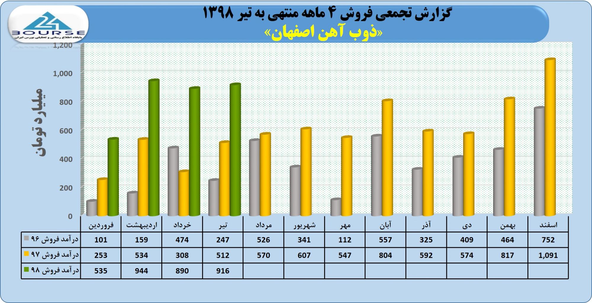 به گزارش کدال نگر بورس ٢۴، درآمد فروش ذوب آهن اصفهان در ۴ ماهه نخست سال ١٣٩٨ با رشد عالی نسبت به مدت مشابه سال قبل، به ٣٢٨۶ میلیارد تومان رسید.