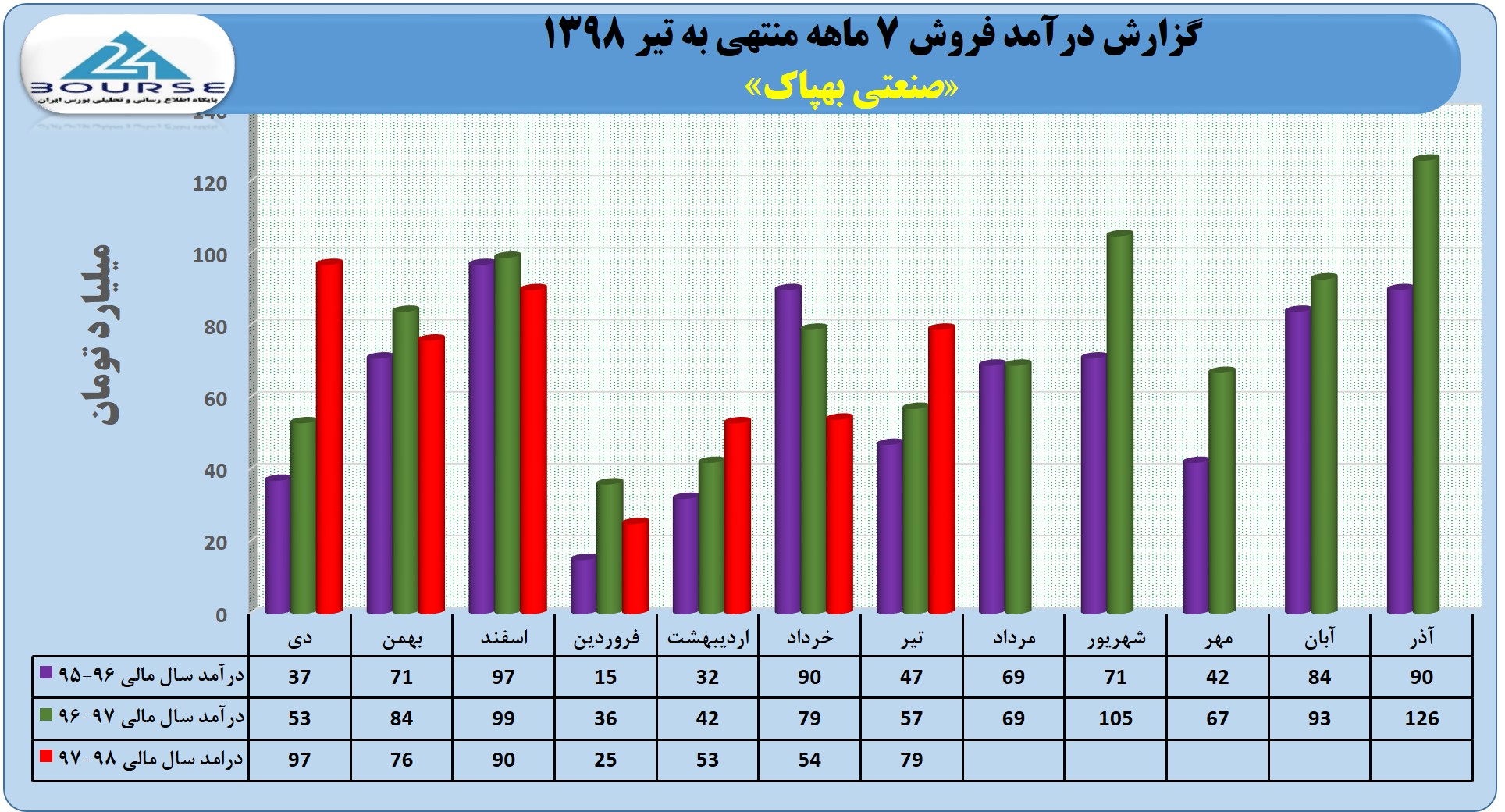 به گزارش کدال نگر بورس ٢۴، مجموع درآمد شرکت صنعتی بهپاک در ٧ ماهه نخست سال مالی منتهی به آذر ١٣٩٨ به حدود ۴٧۶ میلیارد تومان رسید.