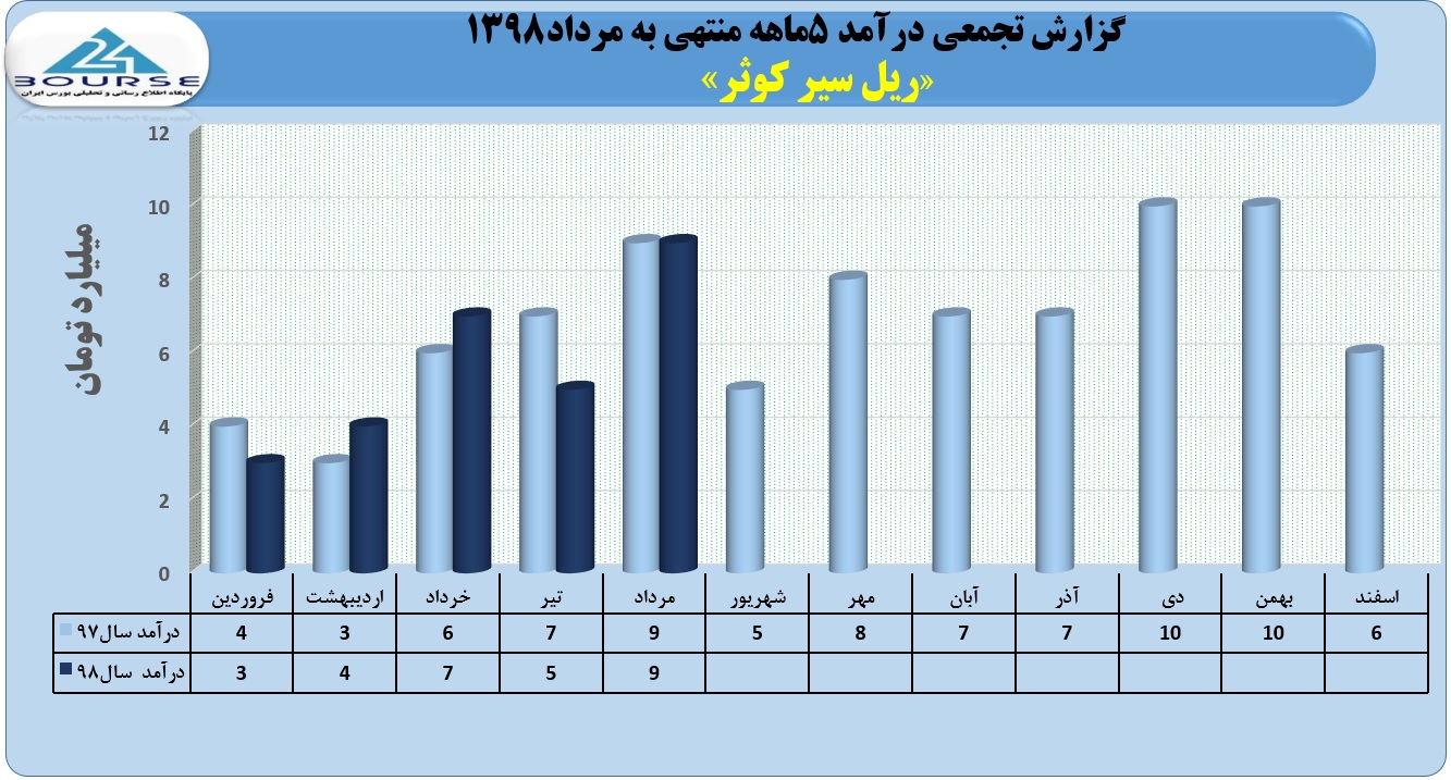 به گزارش کدال نگر بورس ٢۴،شرکت ریل سیر کوثر در ۵ ماهه منتهی به مرداد ٩٨ مبلغ ٢٨ میلیارد تومان درآمد داشته است که ٩ میلیارد تومان از این مبلغ متعلق به مرداد ماه می باشد.گفتنی است درآمد مرداد ماه بیشترین درآمد ماهانه در سال جاری بوده است.