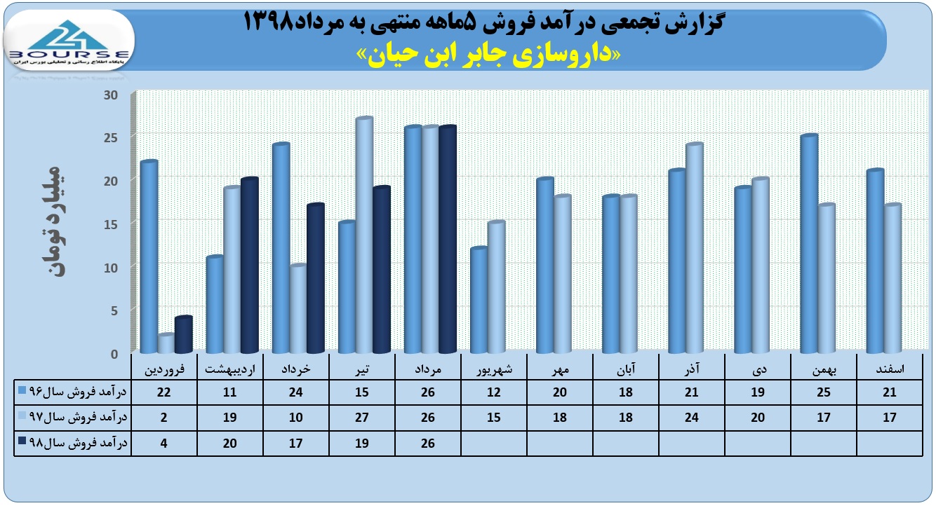 به گزارش کدال نگر بورس ٢۴،شرکت داروسازی جابر ابن حیان در ۵ ماهه منتهی به مرداد ٩٨ مبلغ ٨۵میلیارد تومان درآمد فروش داشته است که نسبت به دوره مشابه سال قبل حدود ١درصد افزایش داشته است .گفتنی است فروش مرداد ماه نیز ٢۶میلیارد تومان بود.