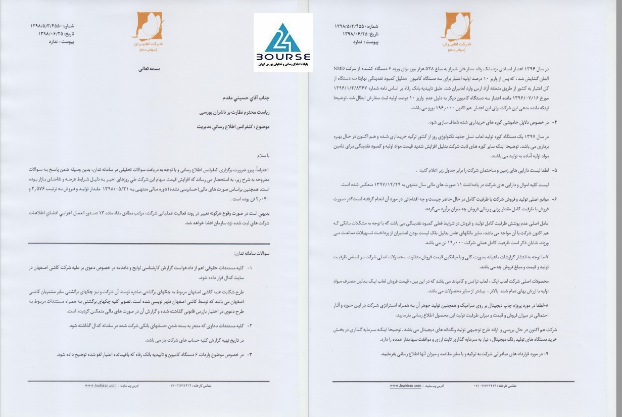 به گزارش کدال نگر بورس ٢۴، شرکت لعابیران اهم مطالب مطرح شده در کنفرانس اطلاع رسانی برگزار شده را منتشر نمود.