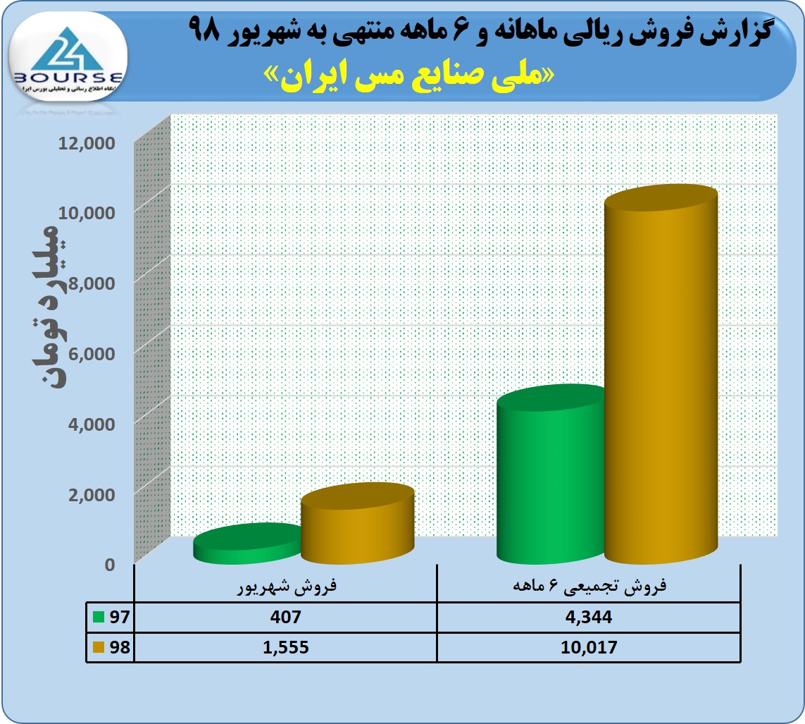 به گزارش کدال نگر بورس ٢۴ شرکت ملی صنایع مس ایران در ۶ ماهه منتهی به شهریور ١٣٩٨ از فروش محصولات خود ١٠٠١٧ میلیارد تومان درآمد کسب نمود که مبلغ ١۵۵۵ میلیارد تومان آن مربوط به فروش شهریور ماه می باشد. گفتنی است مبلغ فروش این شرکت در مدت ۶ ماهه سال ٩٨ در مقایسه با مدت مشابه سال قبل ١٣١ درصد رشد داشته است.