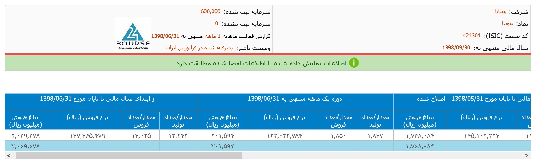 ویتانا به طور متوسط در 8 ماهه سال مالی خود، فروش 22 میلیارد تومانی داشته است که حالا مدتی است فروش شرکت متحول شده و شرکت در وضعیت بسیار خوبی قرار گرفته است.