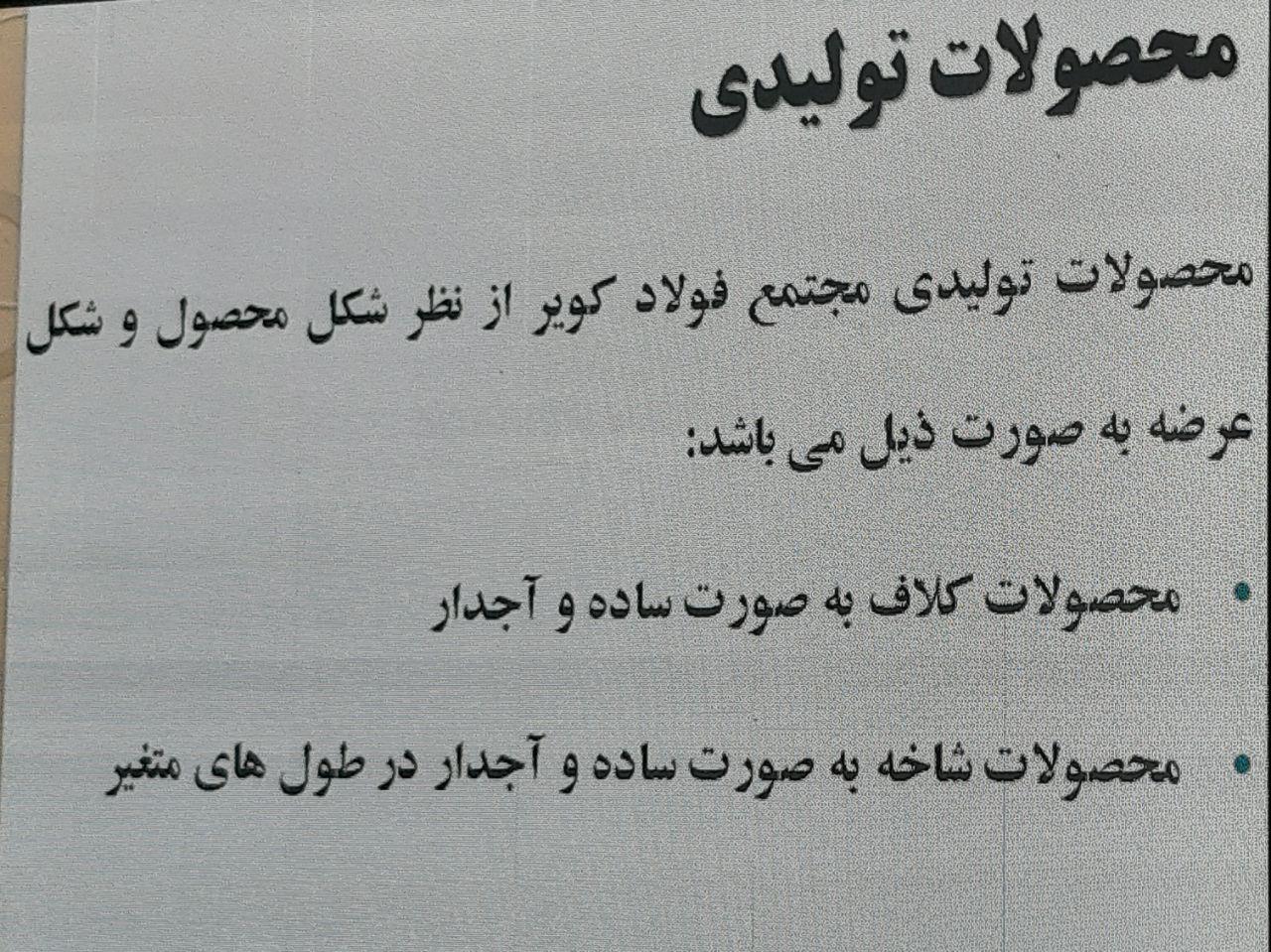 گفتنی است، محصولات تولیدی مجتمع فولاد کویر از نظر شکل محصول و شکل عرضه، محصولات کلاف به صورت ساده و آجدار، محصولات شاخه به صورت ساده و آجدار در طول های متغییر است.