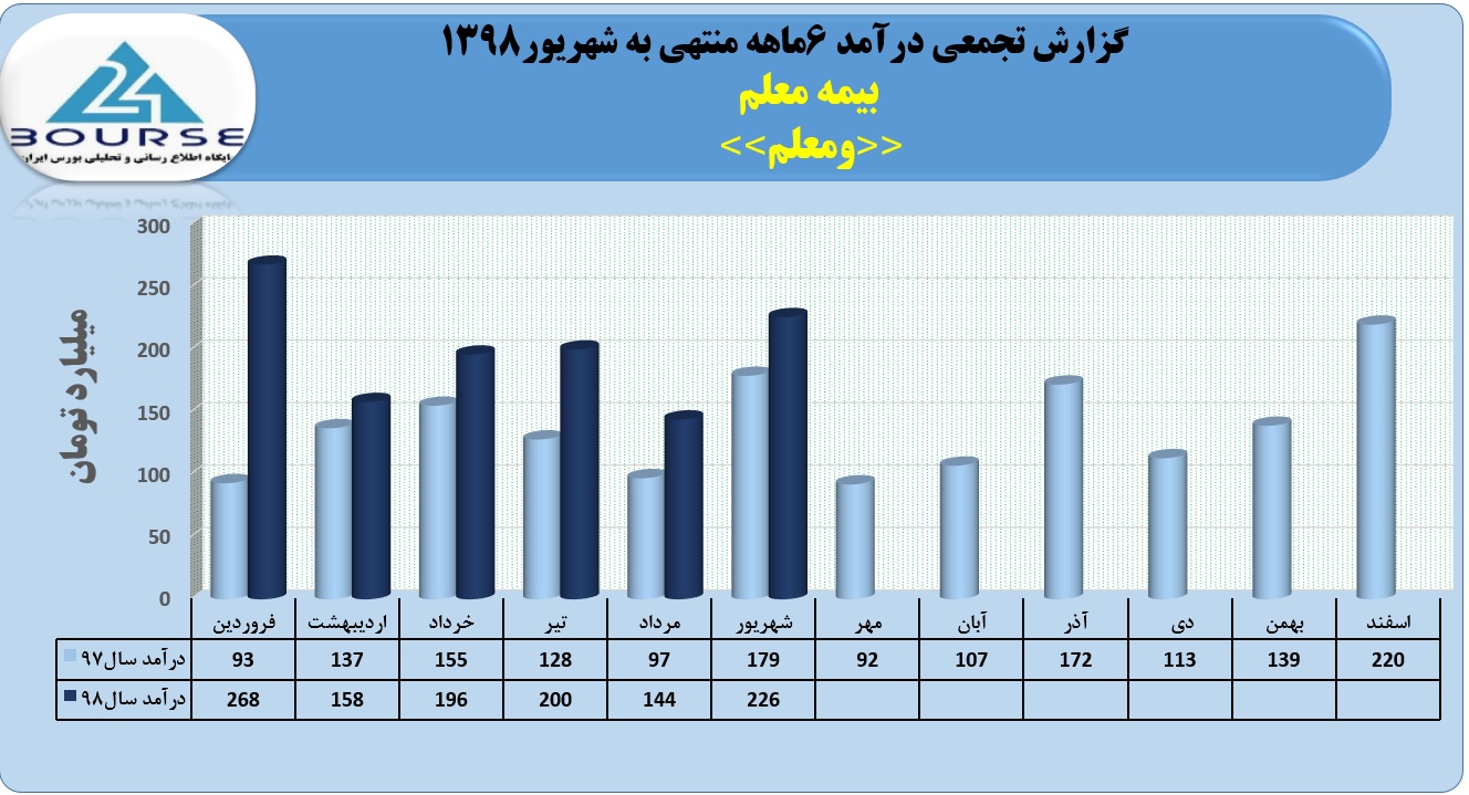 به گزارش کدال نگر بورس ٢۴،شرکت بیمه معلم در ۶ماهه منتهی به شهریور ١٣٩٨ مبلغ ١١٩۴میلیارد تومان از محل حق بیمه صادره درآمد داشته است که ٢٢۶میلیارد تومان از این مبلغ متعلق به شهریور ماه می باشد.