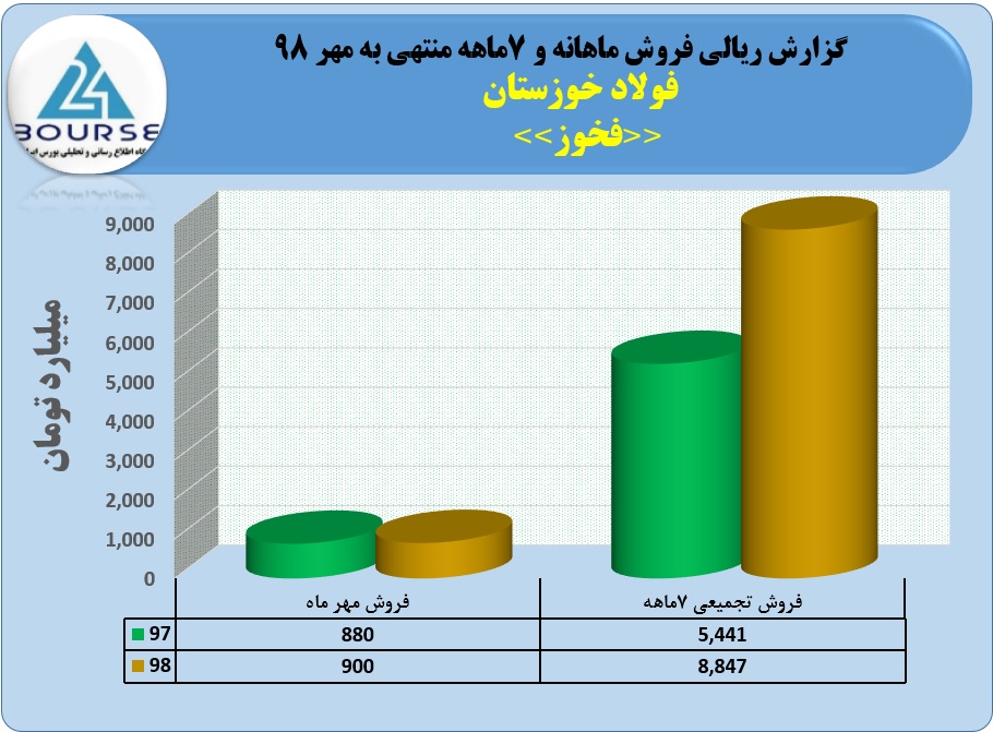 به گزارش کدال نگر بورس٢۴،شرکت فولاد خوزستان در ٧ماهه منتهی به مهر ٩٨ حدود ٨٨۴٧میلیارد تومان فروش داشته است که حدود۶٣درصد نسبت به دوره مشابه قبل رشد داشته است. فروش مهر ماه حدود٩٠٠میلیارد تومان می باشد.
