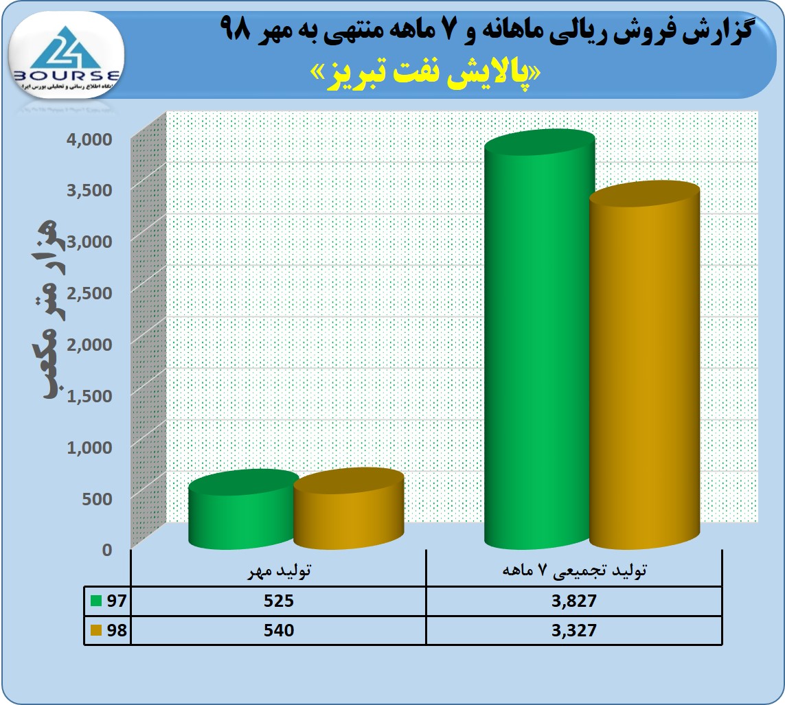به گزارش کدال نگر بورس ٢۴ شرکت پالایش نفت تبریز در ٧ ماهه منتهی به مهر ١٣٩٨ حدود ٣٣٢٧ هزار متر مکعب تولید داشت که از این مقدار حدود ۵۴٠ هزار مترمکعب در مهر ماه تولید شده است.