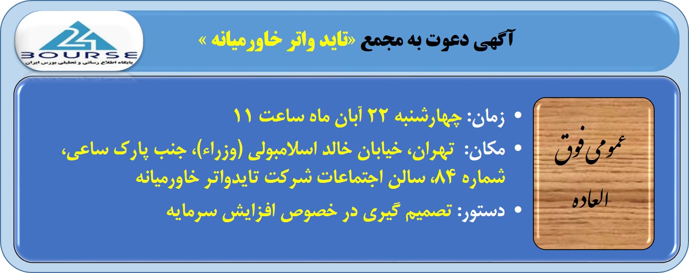 به گزارش کدال نگر بورس ٢۴، شرکت تاید واتر خاورمیانه برای تصمیم گیری در خصوص افزایش سرمایه، سهامداران خود را به مجمع فراخواند.