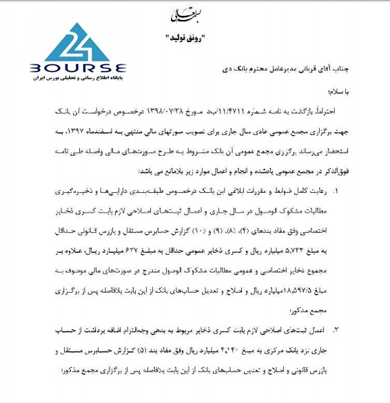 به گزارش کدال نگر بورس٢۴،بانک مرکزی جمهوری اسلامی ایران مجوز برگزاری مجمع عمومی عادی سالیانه بانک دی را با اعمال شرایطی صادر نمود.