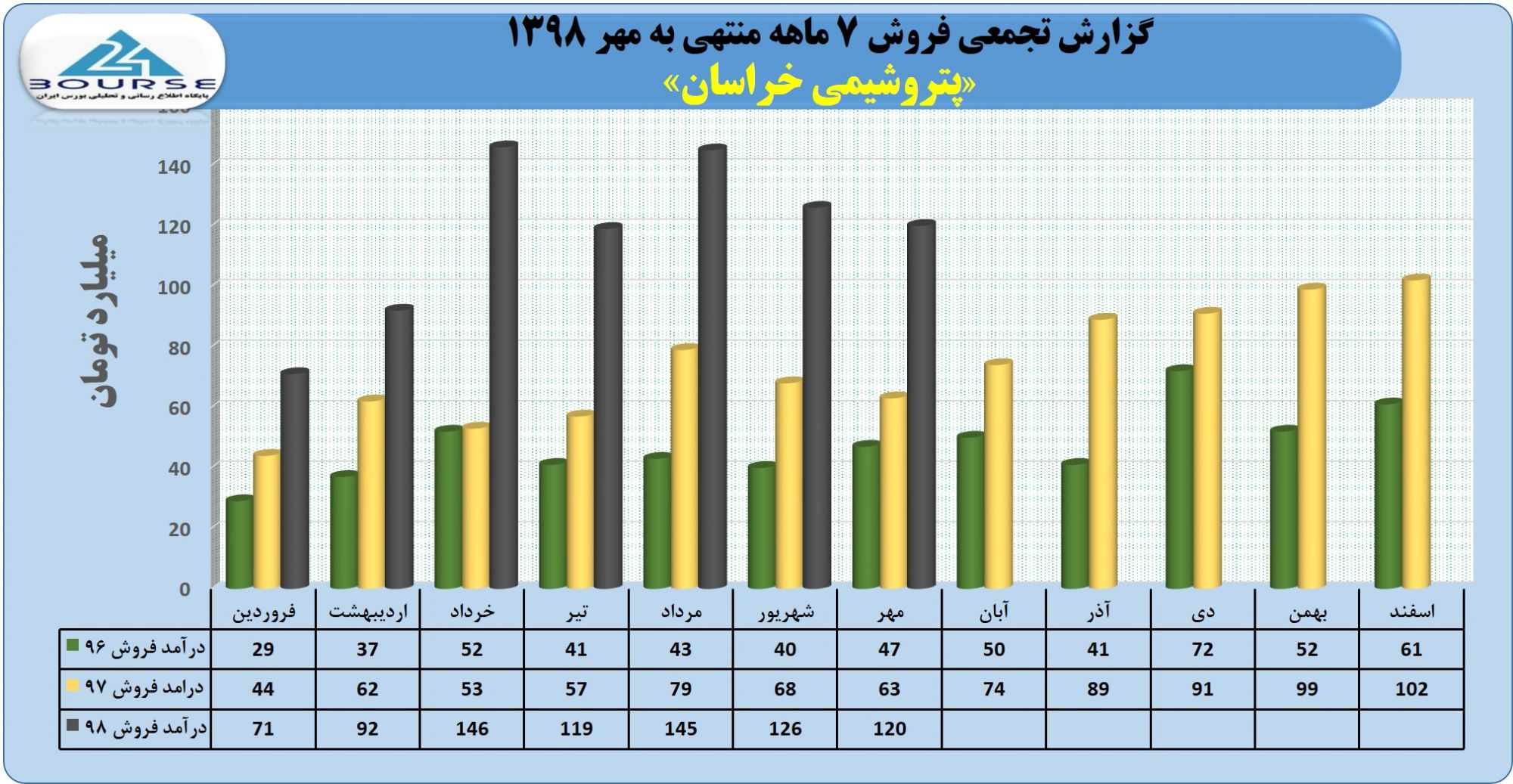 به گزارش کدال نگر بورس ٢۴، شرکت پتروشیمی خراسان در عملکرد ٧ ماهه سال ١٣٩٨ موفق به کسب ٨٠٩ میلیارد تومان درآمد از فروش محصولات خود شد.