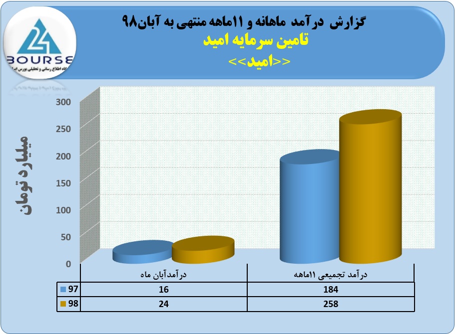 به گزارش کدال نگر بورس٢۴،شرکت تامین سرمایه امید در ١١ماهه منتهی به آبان ١٣٩٨ حدود٢۵٨میلیارد تومان درآمد داشته است که حدود ٢۴میلیارد تومان متعلق به آبان ماه می باشد.درآمد١١ماهه سال جاری در مقایسه با دوره مشابه گذشته حدود ۴٠درصد رشد داشته است.
