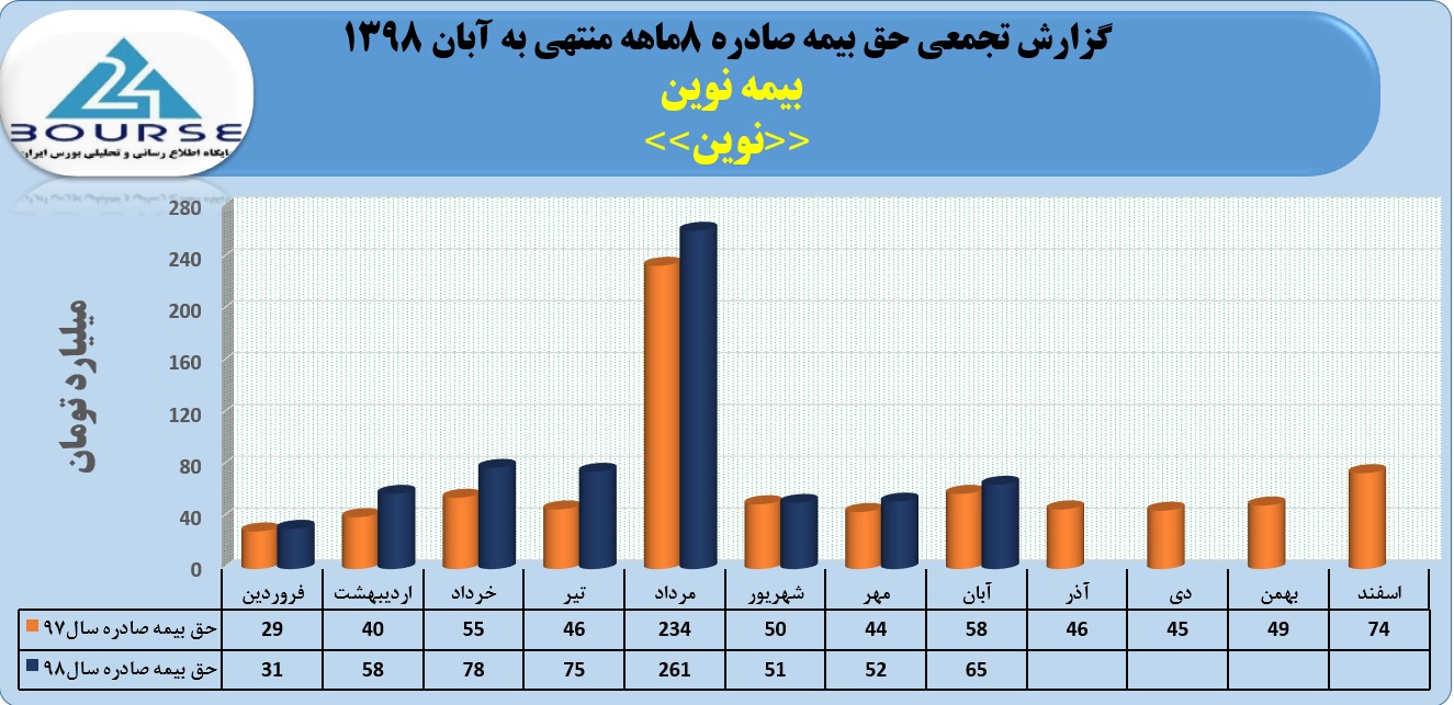 به گزارش کدال نگر بورس٢۴،مجموع حق بیمه صادره ٨ماهه منتهی به آبان ٩٨ بیمه نوین حدود۶٧٢ میلیارد تومان می باشد که حدود ۶۵ میلیارد تومان متعلق به آبان ماه می باشد.