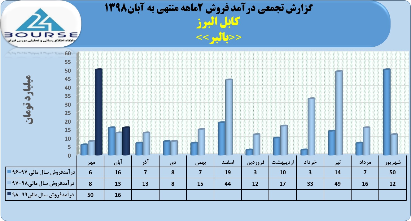به گزارش کدال نگر بورس٢۴،مجموع فروش ٢ ماهه منتهی به آبان ١٣٩٨ کابل البرز ۶۶ میلیارد تومان می باشد که ١۶ میلیارد تومان متعلق به آبان ماه می باشد.