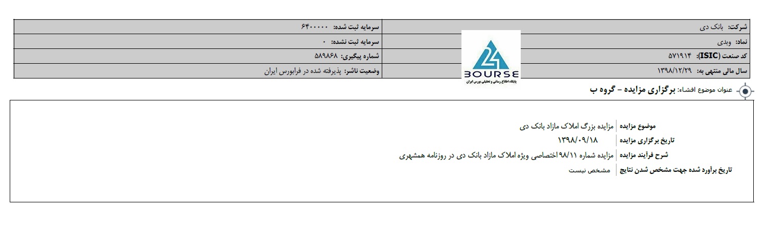 به گزارش کدال نگر بورس ٢۴، بانک دی از تصمیم خود مبنی بر برگزاری مزایده بزرگ املاک مازاد خبر داد.