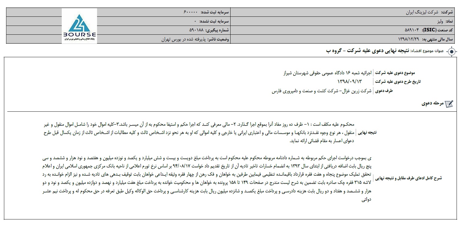 به گزارش کدال نگر بورس ٢۴، شرکت لیزینگ ایران از نتیجه نهایی دعوی به طرفیت شرکت زرین غزال- شرکت کشت و صنعت و دامپروری فارس خبر داد.